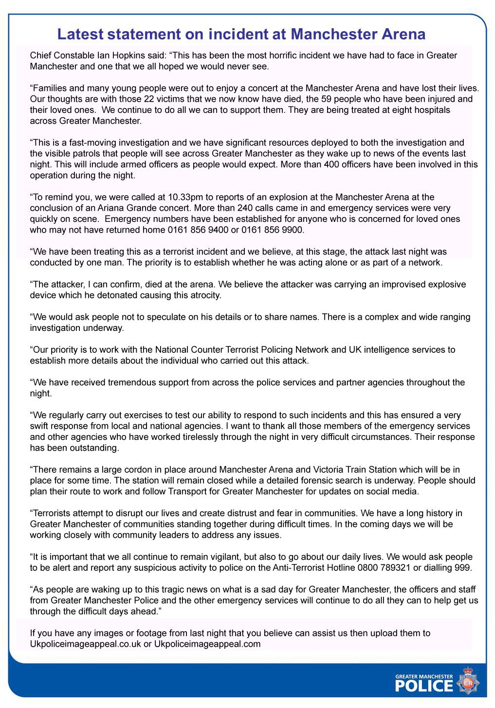 Новый комментарий манчестерской полиции был размещен в Twitter. "Мы считаем на данном этапе, что атака прошлой ночью была совершена одним человеком", - заявил начальник полиции Манчестера Иэн Хопкинс. По его словам, главная задача сейчас - установить, действовал ли смертник в одиночку или как часть террористической сети.